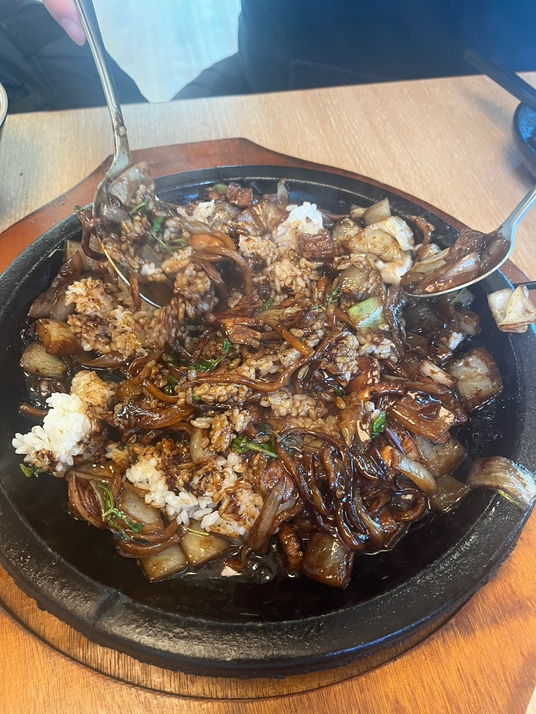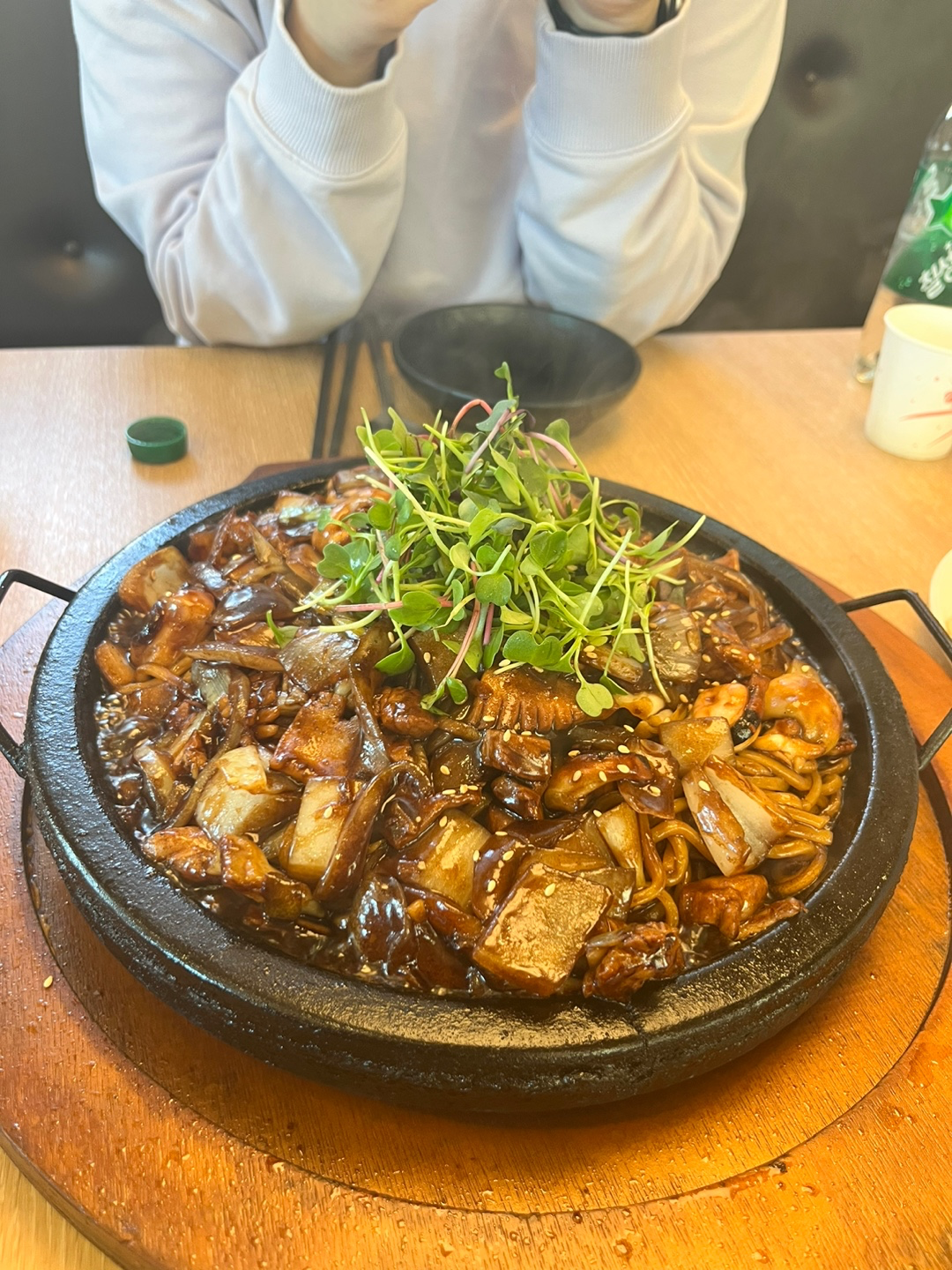 보이는 거 처럼 뜨거운 돌판에 나오는데, 해산물도 적당히 넉넉하고, 약간 볶음 짜장 맛이라고 해야하나?