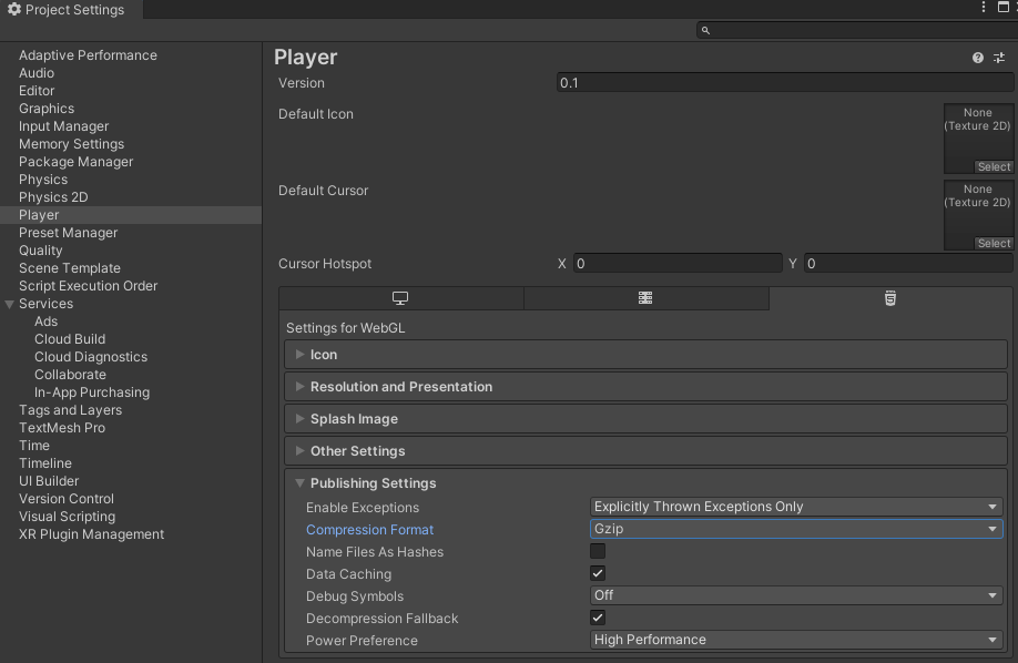- WebGL 플레이어 설정 창(메뉴: Edit > Project Settings > Player에서 WebGL을 선택한 후 Publishing Settings 섹션 확장)에서 압축 타입