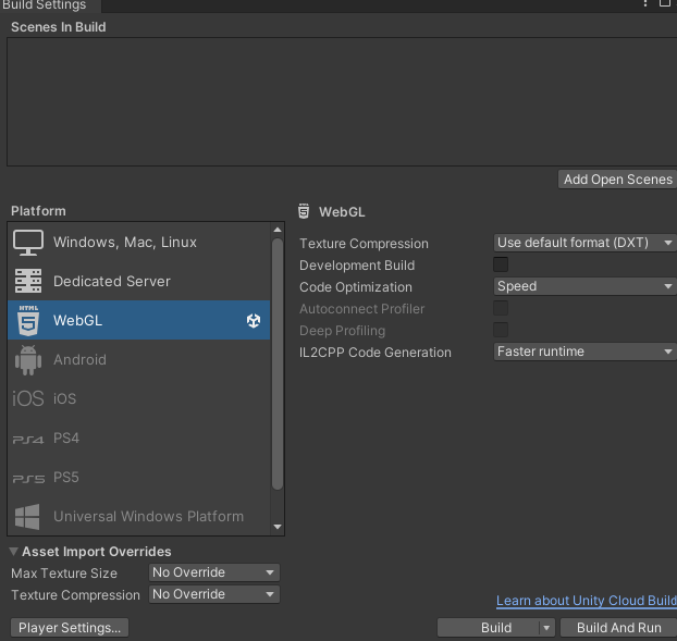 - File - Build Settings에서 WebGL Platform으로 선택합니다.